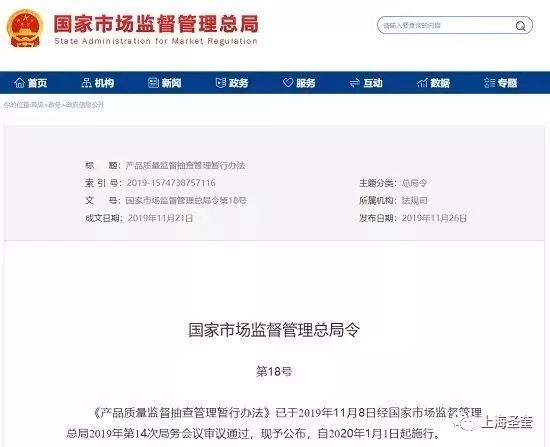 第五十六條 本辦法自2020年1月1日起施行。2010年12月29日原國家質(zhì)量監(jiān)督檢驗檢疫總局令第133號公布的《產(chǎn)品質(zhì)量監(jiān)督抽查管理辦法》、2014年2月14日原國家工商行政管理總局令第61號公布的《流通領(lǐng)域商品質(zhì)量抽查檢驗辦法》、2016年3月17日原國家工商行政管理總局令第85號公布的《流通領(lǐng)域商品質(zhì)量監(jiān)督管理辦法》同時廢止。
