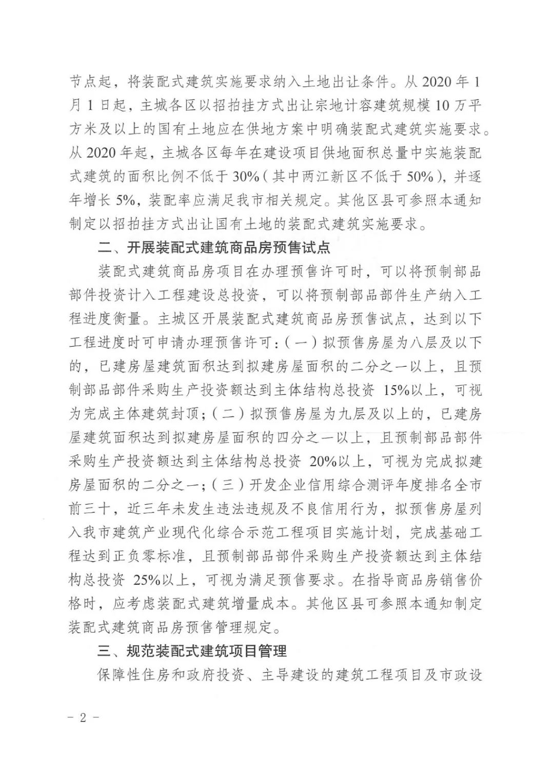 全市保障性住房和建筑面積2000平方米以上的政府投資、主導(dǎo)建設(shè)的建筑工程項(xiàng)目,橋梁、綜合管廊、人行天橋等市政設(shè)施工程項(xiàng)目,應(yīng)根據(jù)渝府辦發(fā)〔2017〕185號(hào)文件要求從相應(yīng)時(shí)間節(jié)點(diǎn)起,采用裝配式建筑或裝配式建造方式。主城各區(qū)已建成學(xué)校、幼兒園、醫(yī)院、養(yǎng)老院、政府機(jī)關(guān)等100米范圍內(nèi)噪聲敏感區(qū)域的出讓地塊,應(yīng)根據(jù)渝府辦發(fā)〔2017〕185號(hào)文件要求從相應(yīng)時(shí)間節(jié)點(diǎn)起,將裝配式建筑實(shí)施要求納入土地出讓條件。從2020年1月1日起,主城各區(qū)以招拍掛方式出讓宗地計(jì)容建筑規(guī)模10萬(wàn)平方米及以上的國(guó)有土地應(yīng)在供地方案中明確裝配式建筑實(shí)施要求。從2020年起,主城各區(qū)每年在建設(shè)項(xiàng)目供地面積總量中實(shí)施裝配式建筑的面積比例不低于30%(其中兩江新區(qū)不低于50%),并逐年增長(zhǎng)5%,裝配率應(yīng)滿足我市相關(guān)規(guī)定。其他區(qū)縣可參照本通知制定以招拍掛方式出讓國(guó)有土地的裝配式建筑實(shí)施要求。